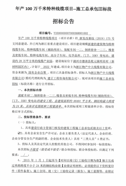 年產(chǎn)100萬千米特種線纜項目--施工總承包Ⅲ標段招標公告